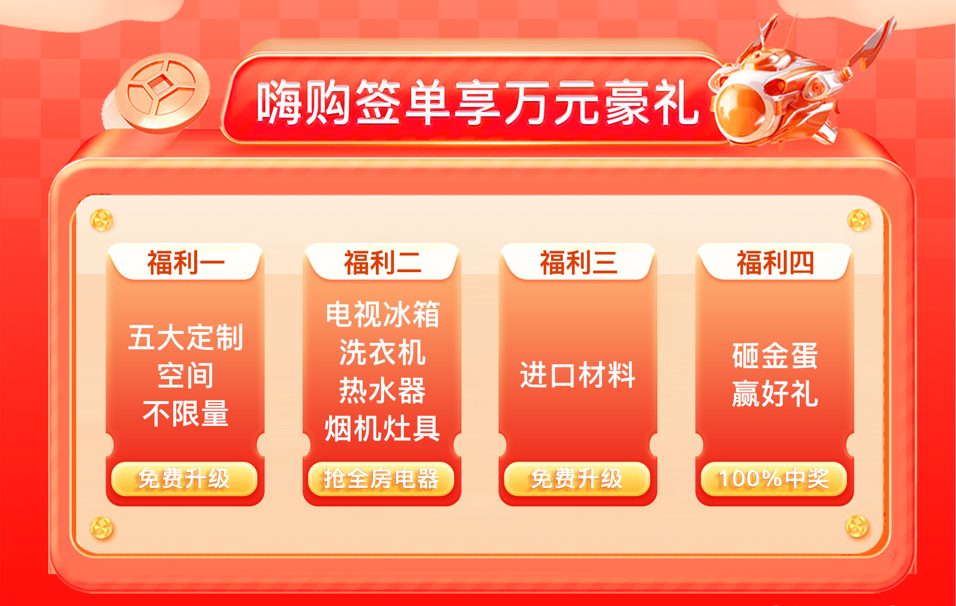 砸金蛋百分百中獎:活動期間簽約,即可參與砸金蛋活動,獎品從裝修基金到品牌家居用品,100%中獎,驚喜不斷!
