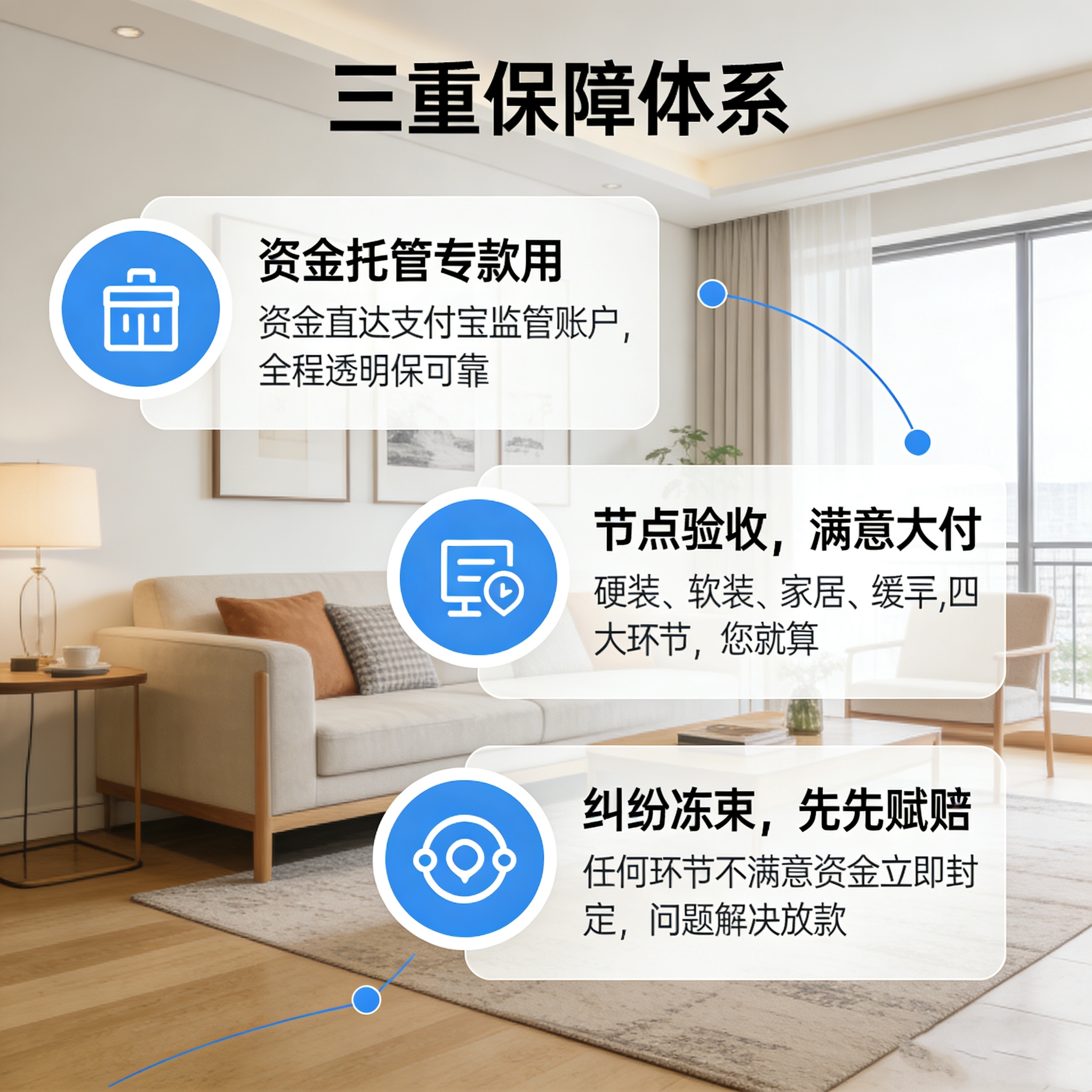 專(zhuān)款專(zhuān)用,物理隔離:您的錢(qián),始終在您名下的支付寶賬戶(hù)中,與裝飾公司的運(yùn)營(yíng)資金完全隔離。從根本上杜絕了“資金被挪用”的風(fēng)險(xiǎn)。